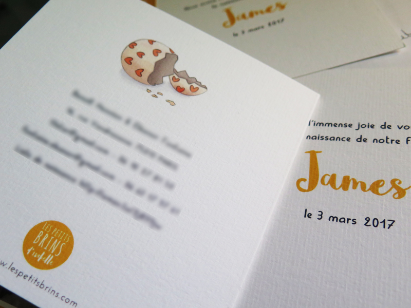 Tu es donc né le 3 mars 2017, et quelques jours après Maman Poulet m’a écrit pour me donner les informations sur ta naissance, tes plus jolies photos et lancer l’impression. Le faire-part est carré (13 x 13 cm format fermé) au format livret (4 pages) avec un pli. Il est imprimé sur un papier d’art épais : 300 gr Rives Vergé Blanc Glacier ce qui lui donne une belle texture, et une qualité proche d’un 100% fait main.