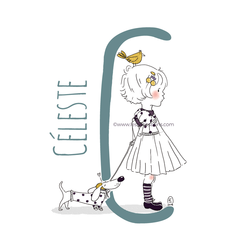 Abécédaire Initiale du prénom de votre enfant. Personnalisez ce doux portrait d’enfant de style rétro vintage, une illustration originale d’Isabelle Monnerot-Dumaine. Pour une petit fille sage, ou coquine, avec son petit chien favori. Pour un cadeau de naissance, un cadeau d’anniversaire, ou tout simplement pour décorer la chambre de votre enfant, nièce, filleule… à offrir ou à s’offrir !