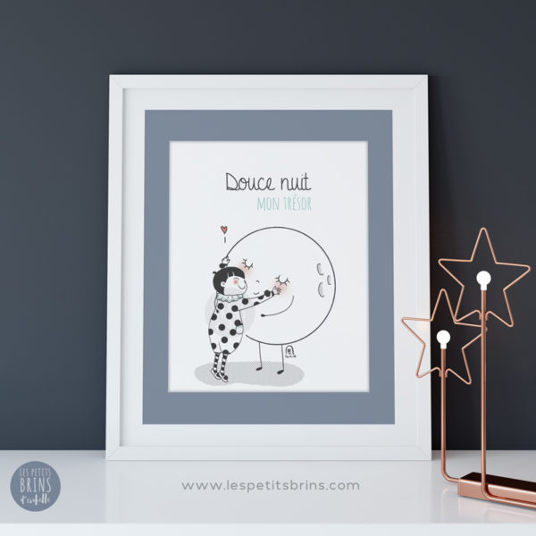 Affiche Super Lune « Douce nuit mon trésor ». Illustration originale d’Isabelle Monnerot-Dumaine. Cette affiche est pleine de poésie et de douceur. Idéal pour un cadeau de naissance, un anniversaire, un faire-part de naissance.