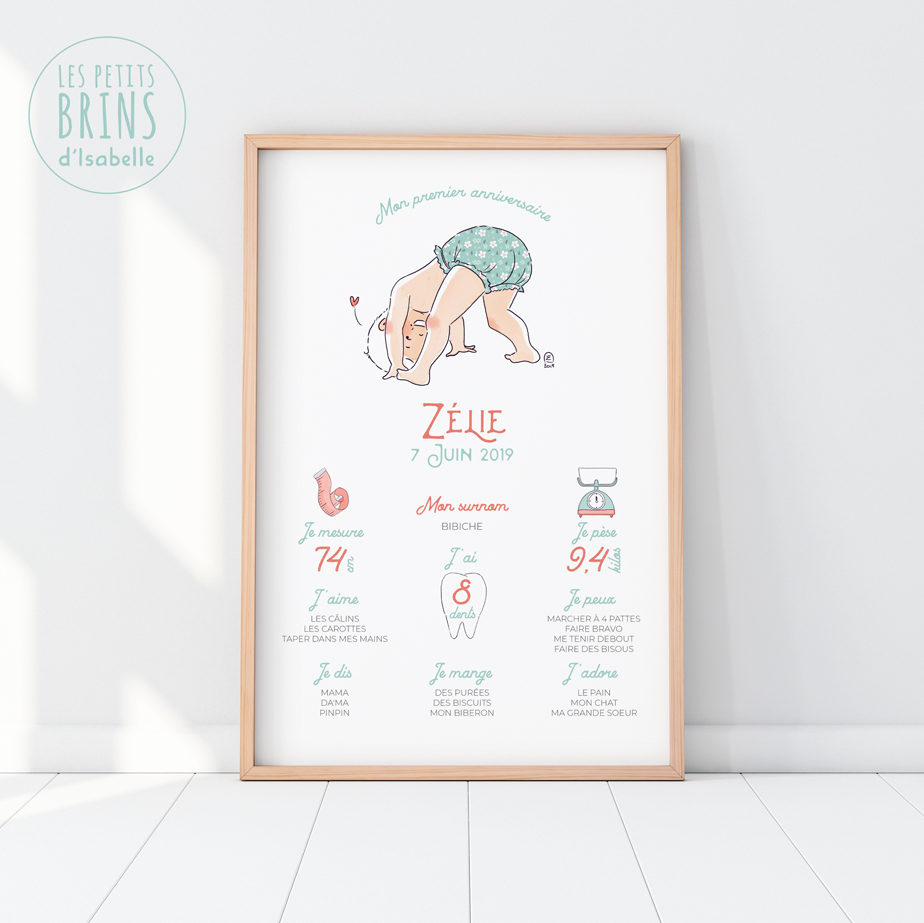 Une affiche personnalisée sur-mesure pour célébrer son premier anniversaire avec l’illustration d’un adorable bébé et les souvenirs de ce bébé de 1 an. Pour décorer le lieu de la fête ou décorer sa chambre. Son surnom, sa date anniversaire, sa taille, son poids, le nombre de dents, ce qu’il sait faire, ce qu’il aime faire, ses premiers mots, ses plats préférés, … Un joli souvenir personnalisable de sa première année pour décorer sa chambre, mais aussi décorer la jolie fête que vous allez préparer pour lui.